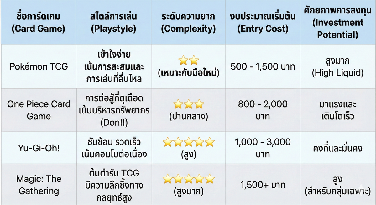 การ์ดเกมยอดฮิตมีหลากหลาย เช่น Pokémon, One Piece, Yu-Gi-Oh! และ Magic: The Gathering ก็มีตลาดที่ต่างกัน ทาง TCG ทำเป็นตารางเปรียบเทียบมาให้ดูง่ายขึ้นค่ะ