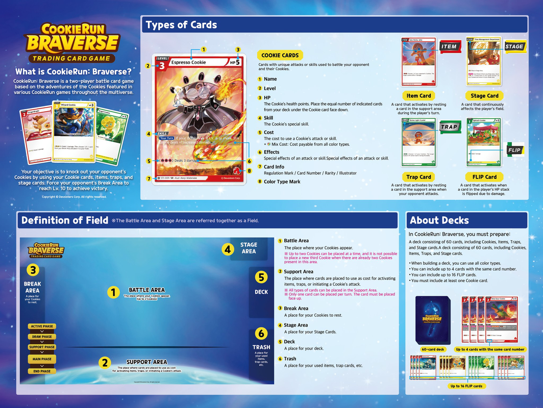 ถ้าพูดถึงเกมมือถือที่คนไทยรู้จักกันดีและมีฐานแฟนคลับขนาดใหญ่ทั้งในไทยและทั่วโลก คงหนีไม่พ้น Cookie Run ที่กลายเป็นแฟรนไชส์จาก Devsisters Studio ของเกาหลีใต้ และตอนนี้พวกเขาได้ก้าวเข้าสู่วงการ Trading Card Game (TCG) อย่างเต็มตัว Cookie Run Braverse การ์ดเกมที่นำตัวละครสุดน่ารักอย่าง GingerBrave, Strawberry Cookie, Dark Choco Cookie และอีกมากมาย มาอยู่บนการ์ดให้ได้เล่น ได้สะสม และได้แข่งขันกันโดยเป้าหมายคือการทำให้คุกกี้ของฝ่ายตรงข้ามหมดพลังงานและชนะในที่สุด! วันนี้เราจะมาทำความรู้จักกันค่ะว่าเกมนี้เล่นยังไง